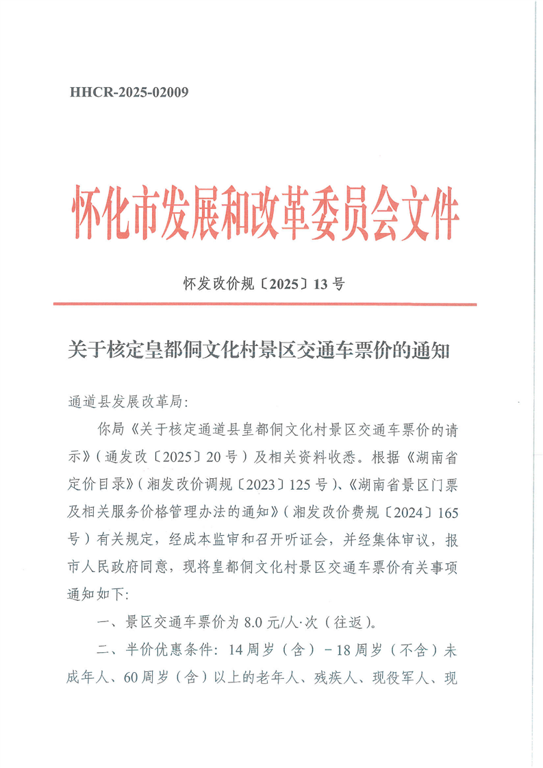 關(guān)于核定皇都侗文化村景區(qū)交通車票價(jià)的通知