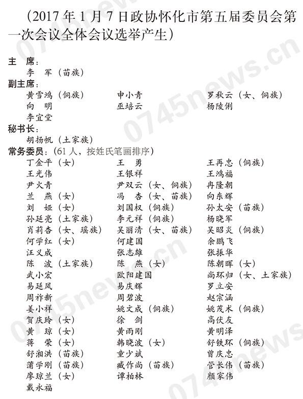 政協(xié)懷化市第五屆委員會主席、副主席、秘書長、常務(wù)委員名單