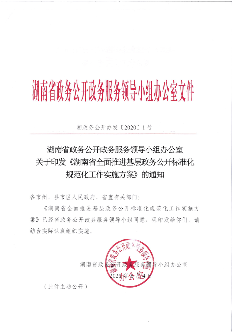 湖南省政務(wù)公開政務(wù)服務(wù)領(lǐng)導(dǎo)小組辦公室關(guān)于印發(fā)《湖南省全面推進(jìn)基層政務(wù)公開標(biāo)準(zhǔn)化規(guī)范化工作實施方案》的通知(湘政務(wù)公開辦發(fā)〔2020〕1號)