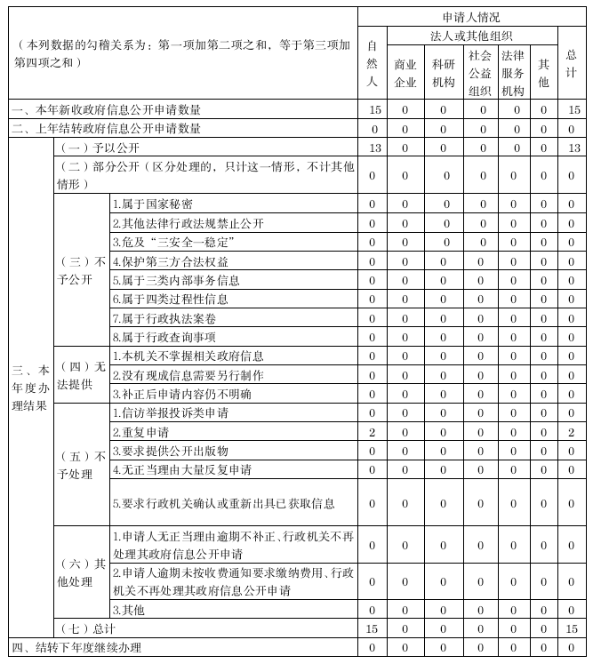 全年收到15信息公開申請,均已按時辦結(jié)。在行政復議、訴訟方面,也未收到有關(guān)政府信息公開的行政復議申請,也未發(fā)生關(guān)于政府信息公開的行政訴訟案件。