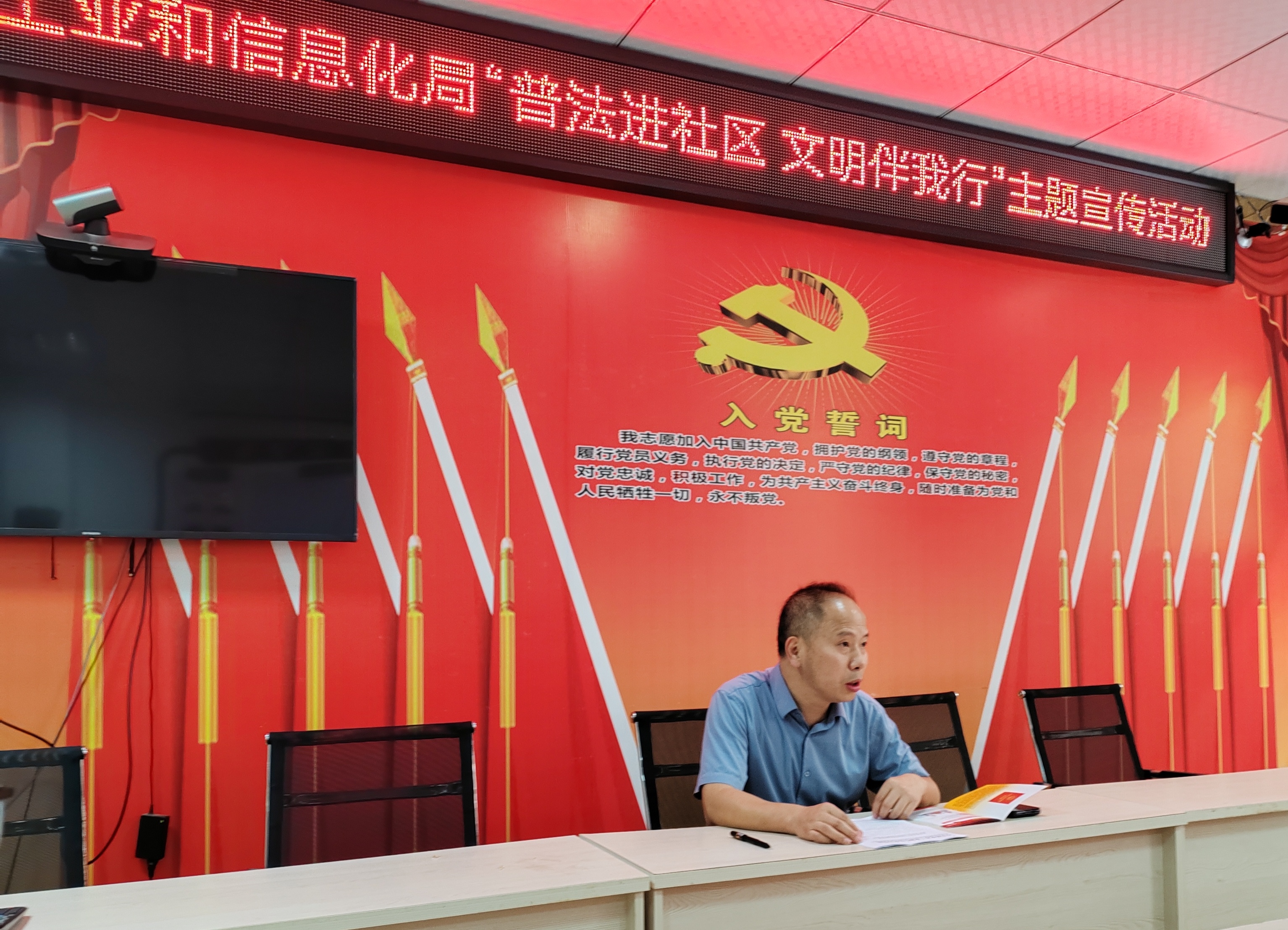七月十四日,懷化市工業(yè)和信息化局干部職工志愿者冒著酷暑炎熱,走進對口幫扶的清水灣社區(qū),開展政務(wù)公開一系列“普法進社區(qū),文明伴我行”主題宣傳活動,為居民群眾帶來憲法、民法和居民生活相關(guān)的電力法規(guī)、安全生產(chǎn)法規(guī)等知識宣傳冊。