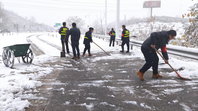 2021年年底,一場大雪襲來,再次拉近了高速“路燈”與防疫“大白”之間的關(guān)系。冰雪阻路,“大白”們果斷換下防護(hù)服,化身“除冰衛(wèi)士”,與收費(fèi)站工作人員共同除冰保暢,在冰雪中共同描繪出最溫暖人心的畫卷。