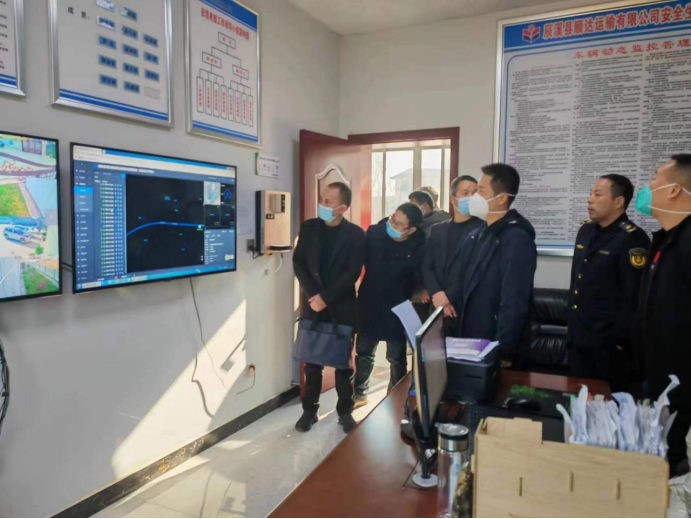 副縣長舒斌(右三)在順達(dá)危貨公司通過監(jiān)控平臺抽查危貨車輛安全運營情況