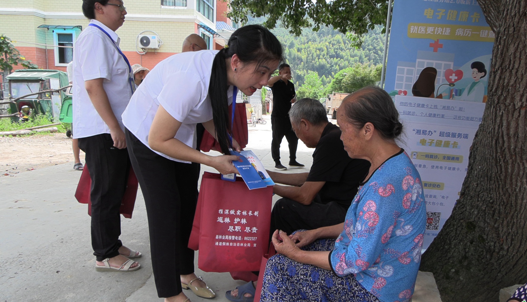 在播陽鎮(zhèn)上寨村,通道縣政務(wù)服務(wù)中心和縣人社局窗口業(yè)務(wù)部門,通過發(fā)放宣傳手冊(cè)、擺放展板的方式,耐心為群眾解讀政務(wù)服務(wù)相關(guān)政策,對(duì)群眾咨詢的各類問題進(jìn)行現(xiàn)場(chǎng)解答。此次政務(wù)下鄉(xiāng)主要解決鄉(xiāng)鎮(zhèn)老人“路途遠(yuǎn)”“行動(dòng)不變”等難題,多聚焦社保待遇領(lǐng)取資格認(rèn)證、工傷保險(xiǎn)、城鄉(xiāng)居民基本養(yǎng)老保險(xiǎn)、靈活就業(yè)養(yǎng)老保險(xiǎn)待遇領(lǐng)取政策等老年人關(guān)心的問題,為他們集中辦理相關(guān)業(yè)務(wù),切實(shí)打通服務(wù)群眾的“最后一米”。