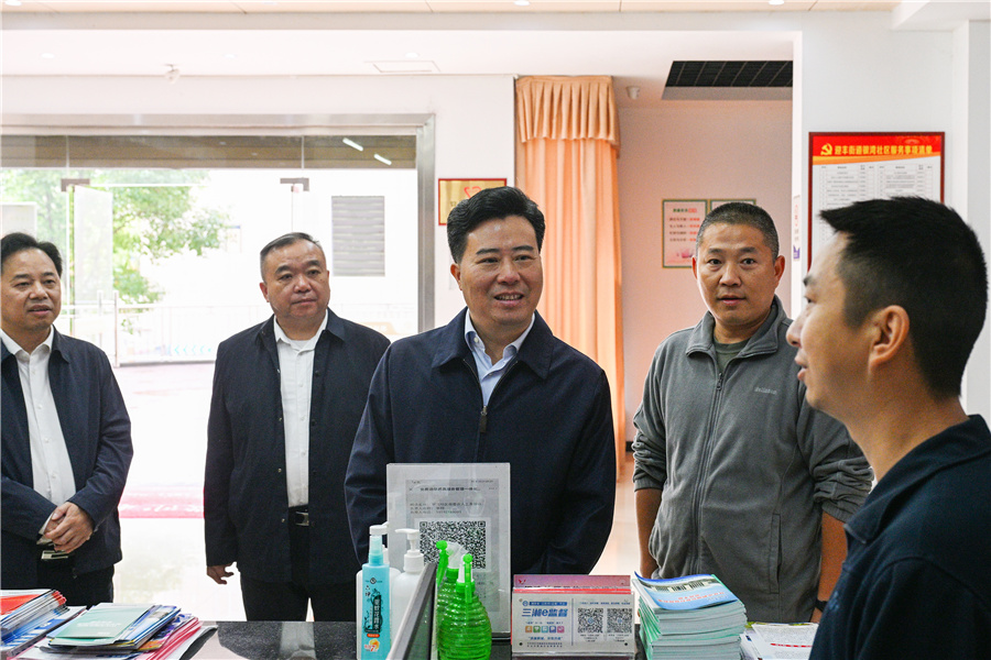 (10月9日上午,市委副書記、市長黎春秋以“四不兩直”方式在鶴城區(qū)督導(dǎo)檢查“一迎三創(chuàng)”工作。圖為黎春秋在迎豐街道銀灣社區(qū)檢查。懷化日報全媒體記者 潘雨 攝)