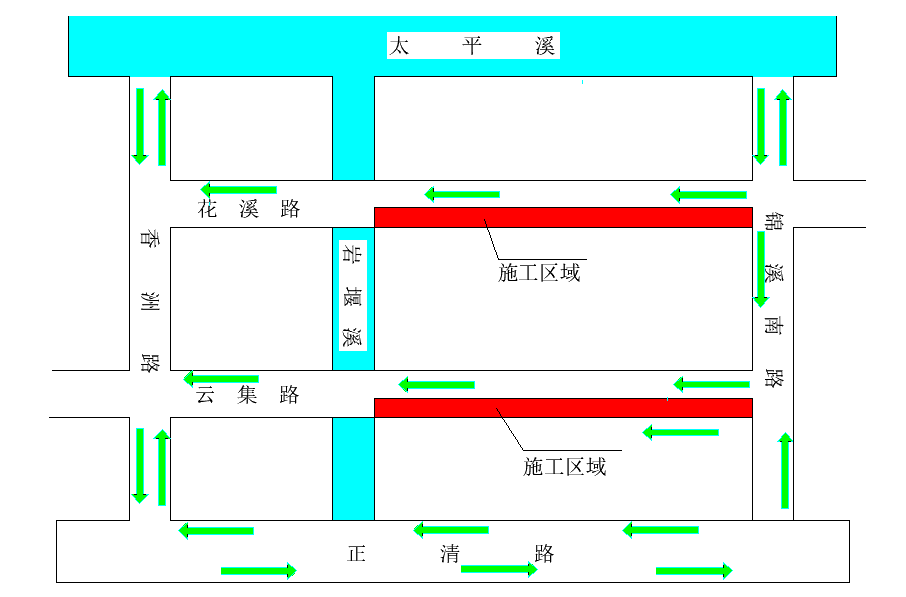 2、花溪路(錦溪南路至巖堰溪)進入南側小區(qū)、道路的車輛錦溪南路繞行至云集路;