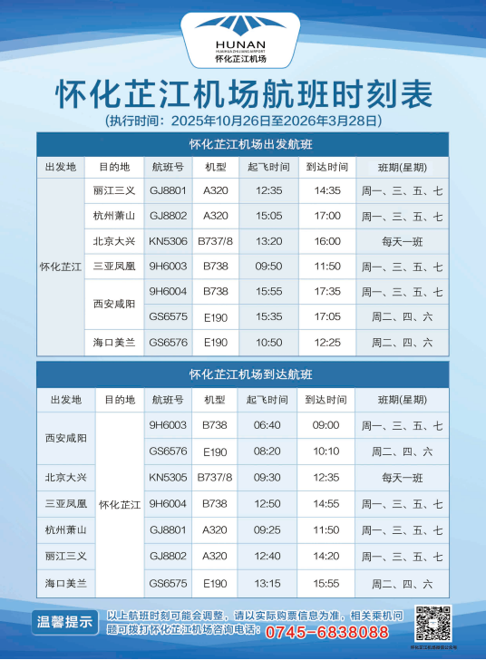 此外,提醒各位旅客,航班信息可能會變化,請以實際購票信息為準(zhǔn),如遇到相關(guān)乘機問題,歡迎撥打懷化芷江機場咨詢電話:0745-6838088。